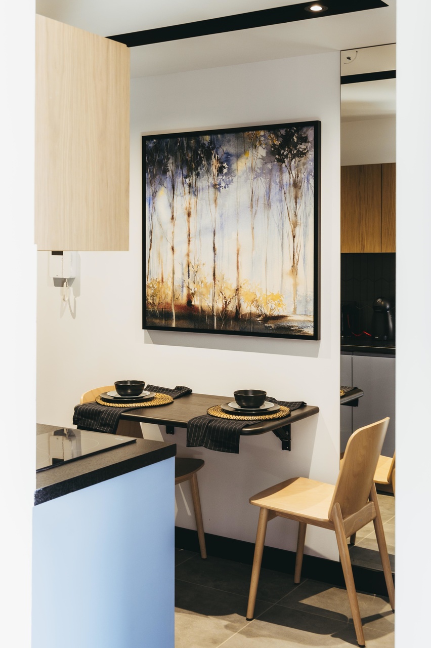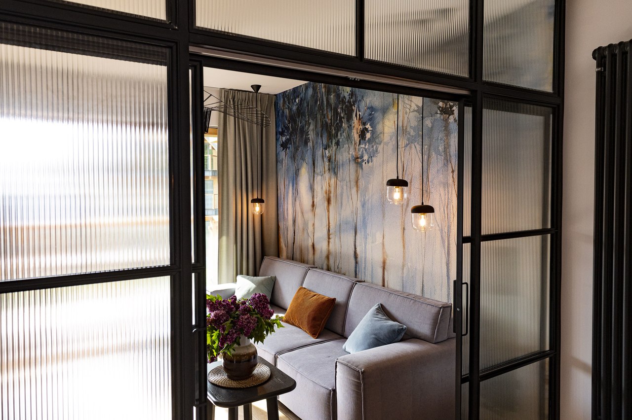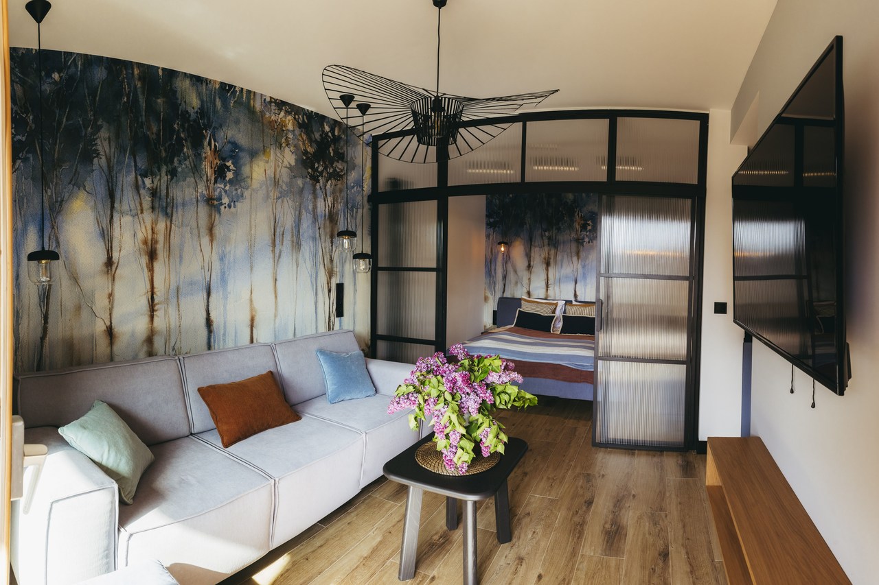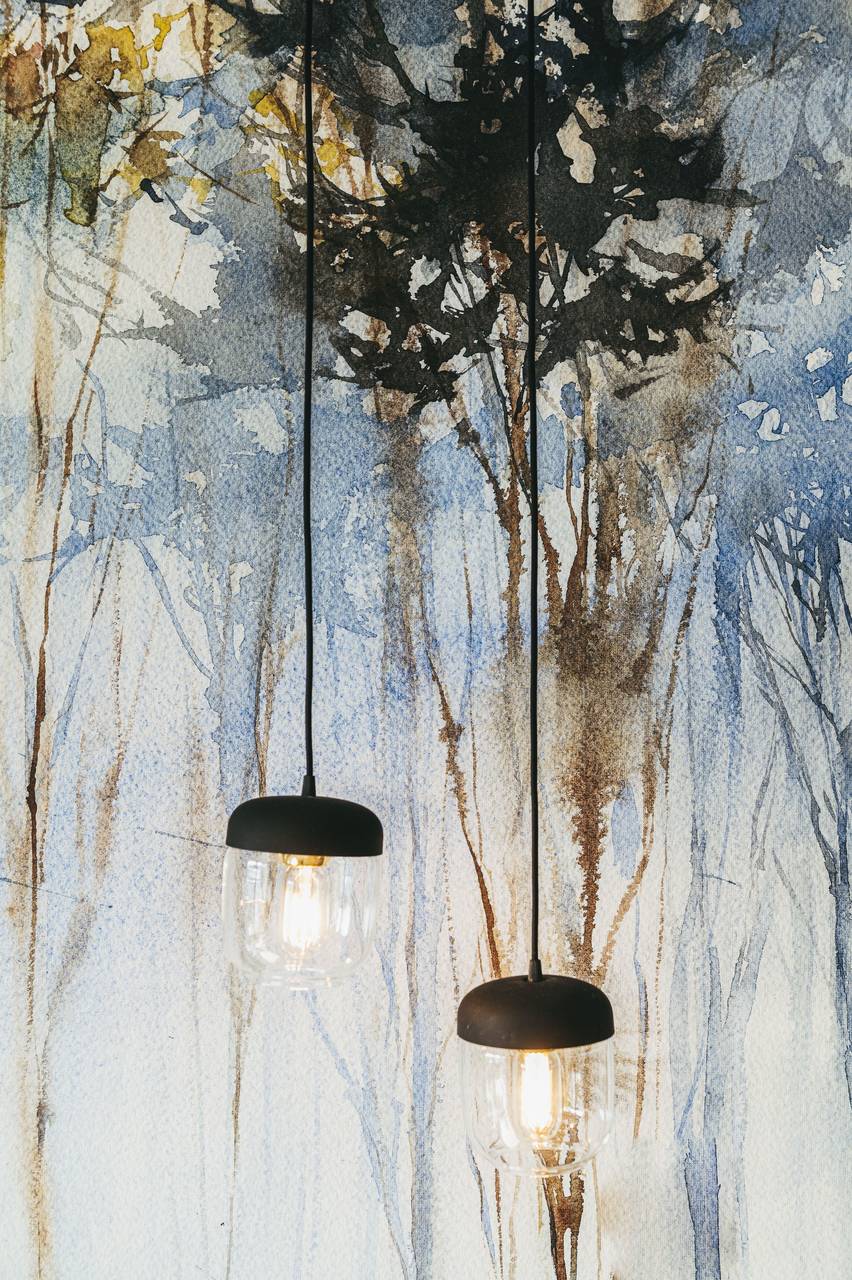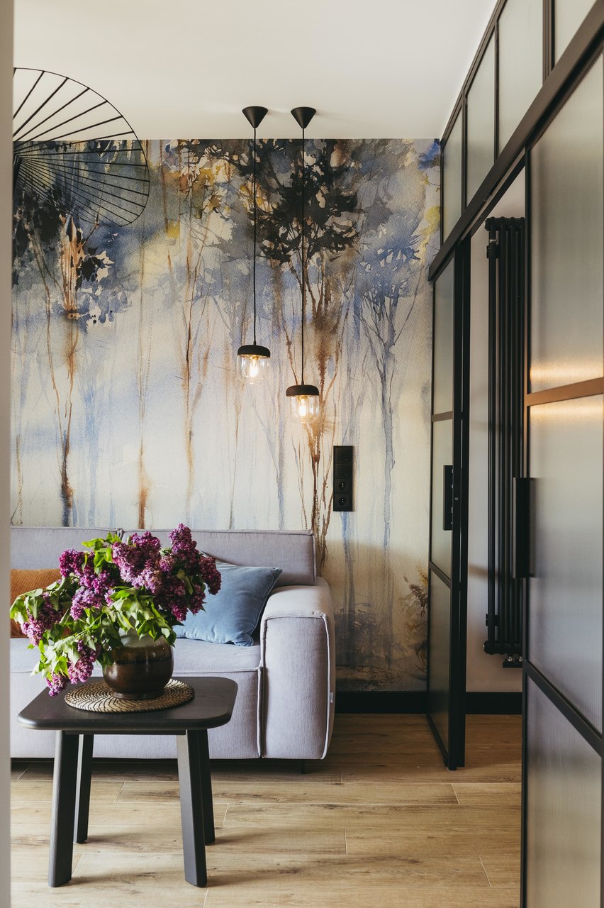 Cudowna tapeta Karelia marki WonderWall studio stała się inspiracją do zaprojektowania całego mieszkania. Drzewa namalowane akwarelą stanowią genialne tło dla innych dodatków. Drewno, brązy, odcienie pomarańczy i błękitu królują w całym wnętrzu.