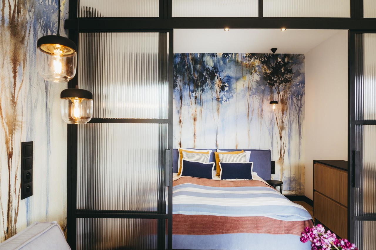 Na małej powierzchni udało się wydzielić sypialnie, którą od salonu oddziela stalowo-szklana ściana. Szkło flutes sprawia, że w sypialni mamy odrobinę prywatności.