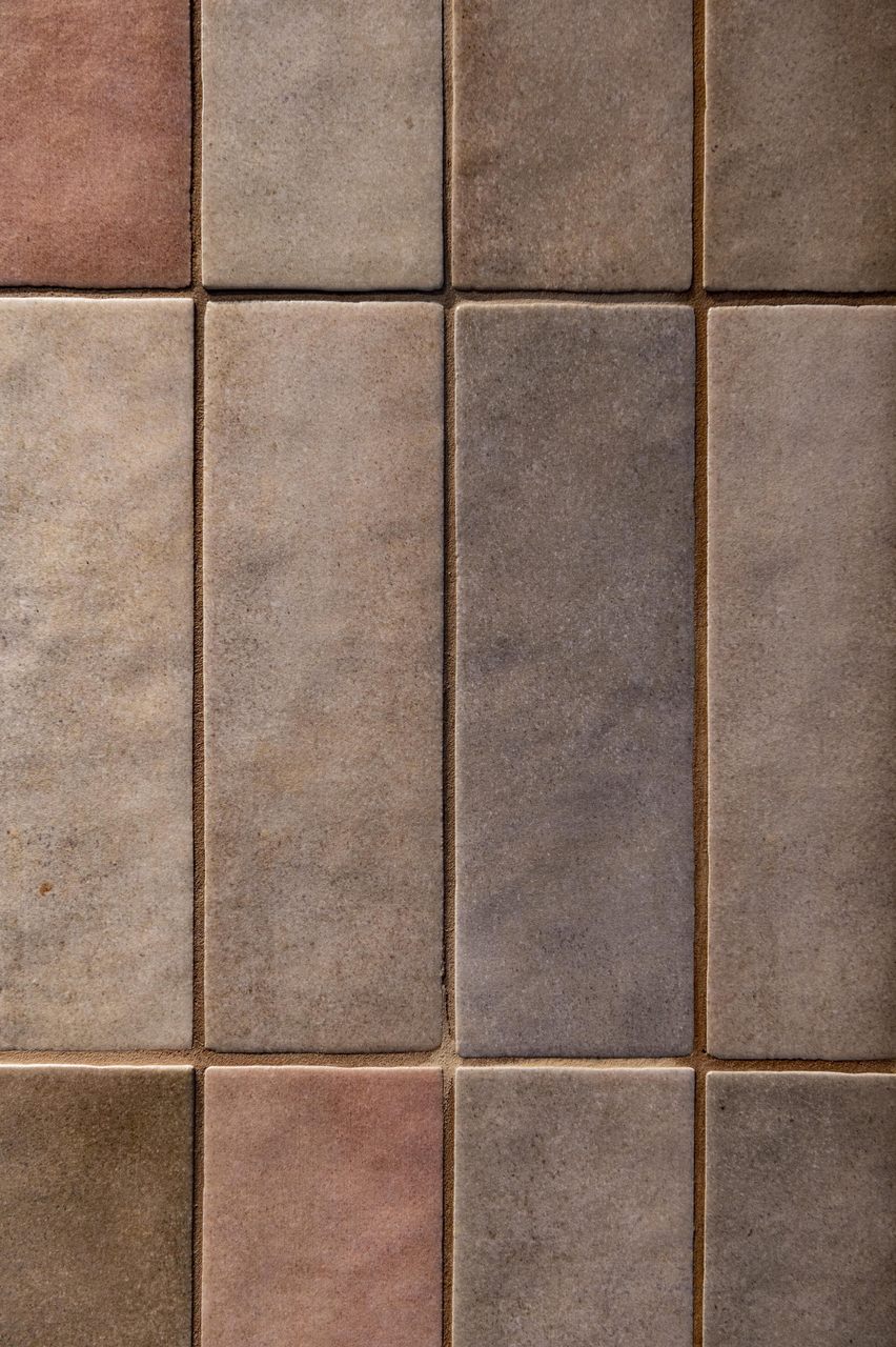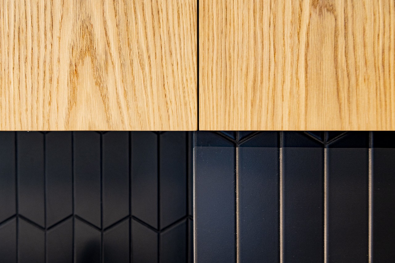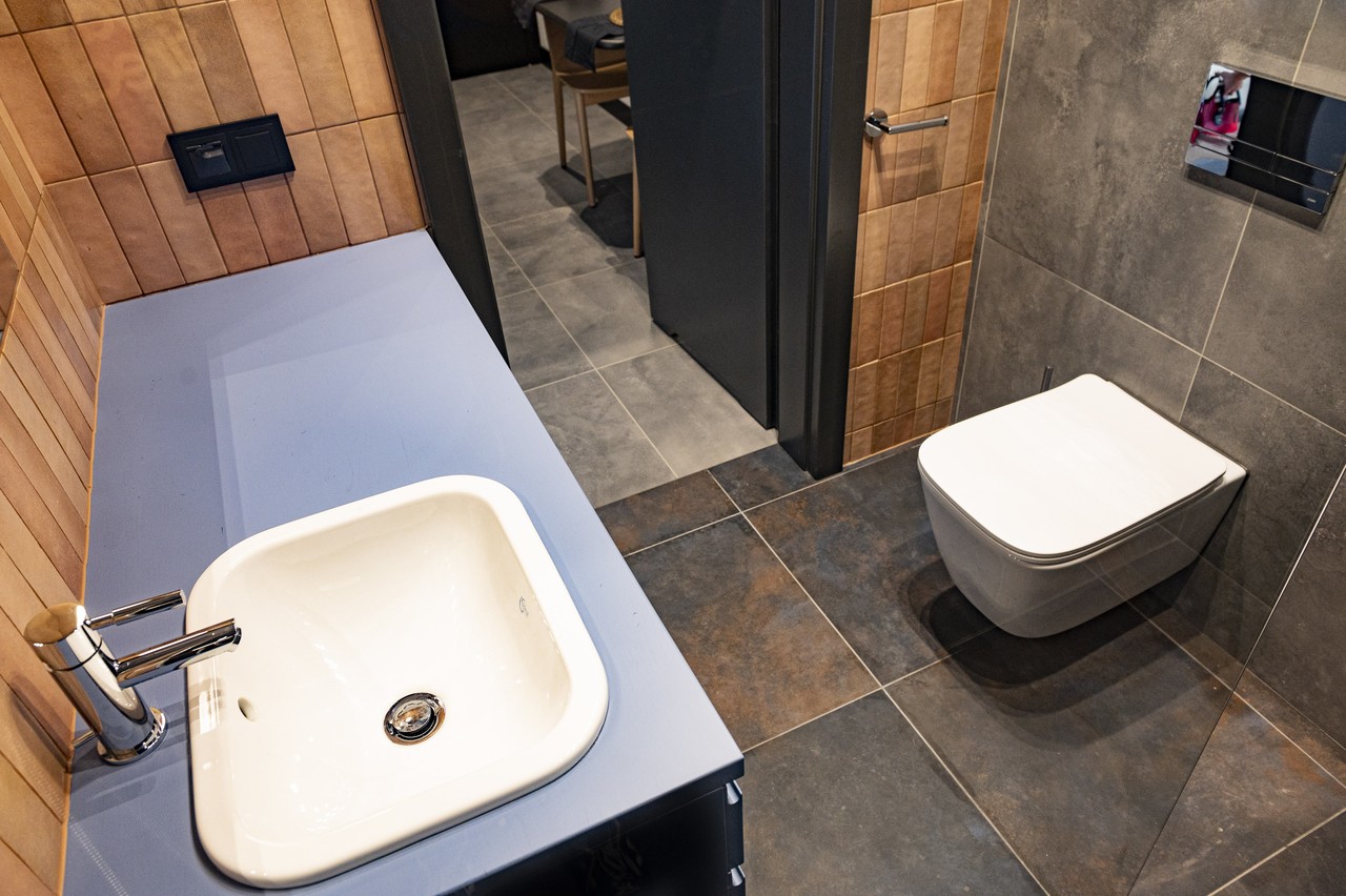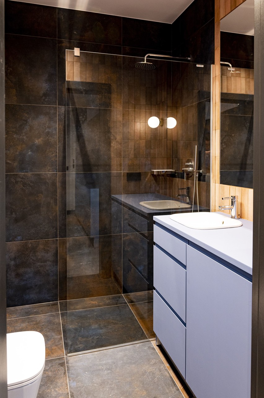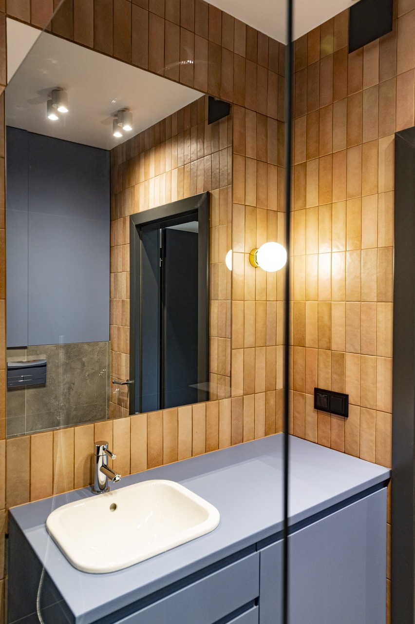 W łazience na ścianach połączyłam płytki w odcieniu brązu i pudrowego różu z płytkami w kolorze granatu połączonego z rdzą.