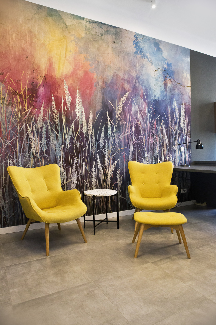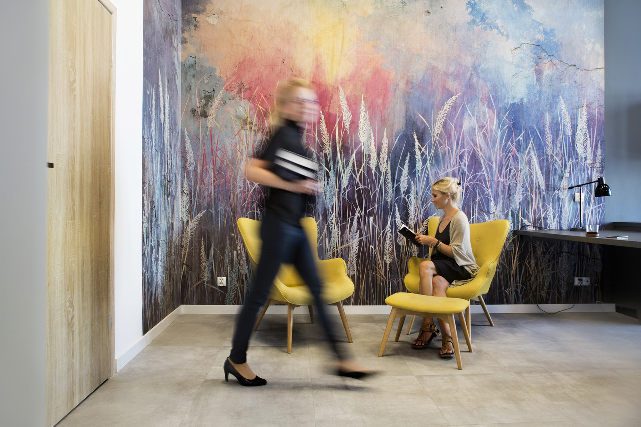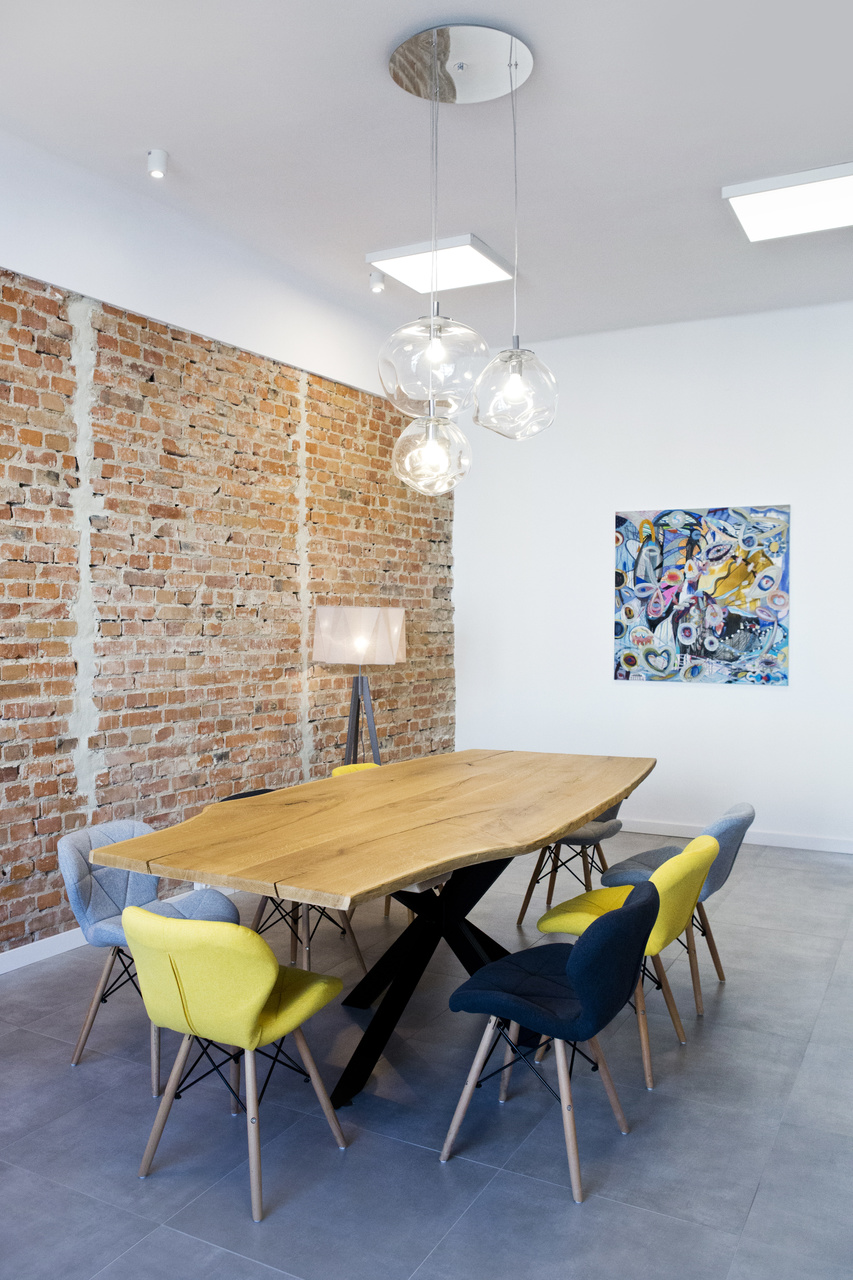 Wnętrze kancelarii prawnej na krakowskim Zabłociu. EDGELAW Adwokaci i Radcowie Prawni to zespół kreatywnych i ambitnych prawników. Wnętrze kancelarii powstało na terenach postindustrialnych przy zabytkowej hucie szkła. Dostosowanie budynku do wymagań biura było dużym wyzwaniem. Poprzez połączenie i remont dwóch zrujnowanych pomieszczeń stworzyliśmy nowoczesne i wygodne stumetrowe biuro. Tapeta SAUVAGE przedstawiająca trawy w odcieniach różu, fioletu i błękitu nadaje elegancji całemu pomieszczeniu. Żółte fotele na tle opisanej tapety prezentują się dostojnie. Hall pokryty farbą w kolorze granatu prowadzi nas do poszczególnych gabinetów pracowników kancelarii. W sali konferencyjnej na jednej ze ścian odsłoniliśmy starą cegłę. Wokół stołu znajdują się kolorowe krzesła pokryte filcem. Nad stołem wisi piękna lampa. Szklane kule prezentują się wspaniale na tle starej cegły. W kancelarii nie mogło zabraknąć sztuki. Obrazy zakupione idealnie wpasowały się w klimat całego wnętrza dodając charakteru całej aranżacji.