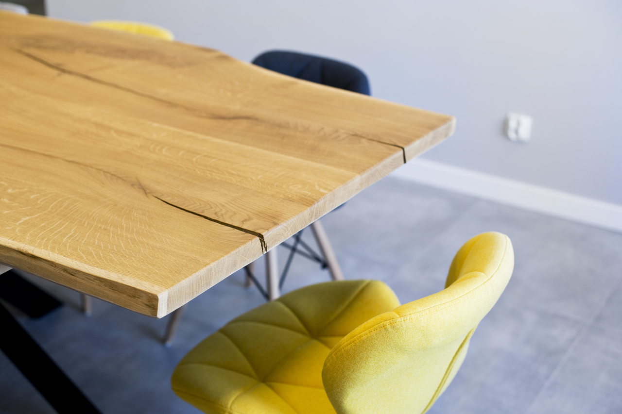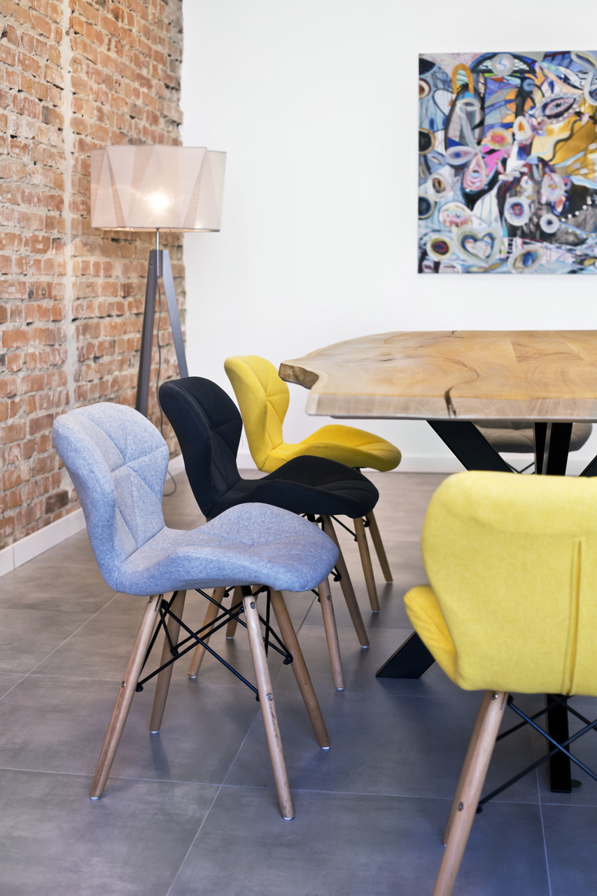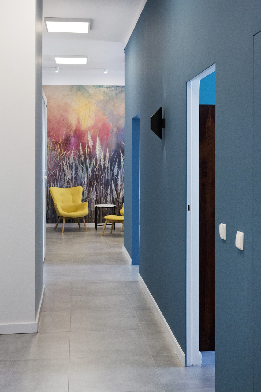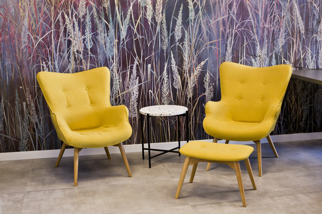 Wnętrze kancelarii prawnej na krakowskim Zabłociu. EDGELAW Adwokaci i Radcowie Prawni to zespół kreatywnych i ambitnych prawników. Wnętrze kancelarii powstało na terenach postindustrialnych przy zabytkowej hucie szkła. Dostosowanie budynku do wymagań biura było dużym wyzwaniem. Poprzez połączenie i remont dwóch zrujnowanych pomieszczeń stworzyliśmy nowoczesne i wygodne stumetrowe biuro. Tapeta SAUVAGE przedstawiająca trawy w odcieniach różu, fioletu i błękitu nadaje elegancji całemu pomieszczeniu. Żółte fotele na tle opisanej tapety prezentują się dostojnie. Hall pokryty farbą w kolorze granatu prowadzi nas do poszczególnych gabinetów pracowników kancelarii. W sali konferencyjnej na jednej ze ścian odsłoniliśmy starą cegłę. Wokół stołu znajdują się kolorowe krzesła pokryte filcem. Nad stołem wisi piękna lampa. Szklane kule prezentują się wspaniale na tle starej cegły. W kancelarii nie mogło zabraknąć sztuki. Obrazy zakupione idealnie wpasowały się w klimat całego wnętrza dodając charakteru całej aranżacji.