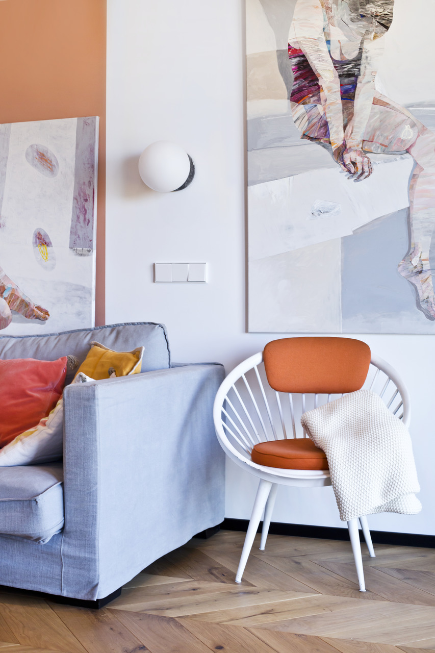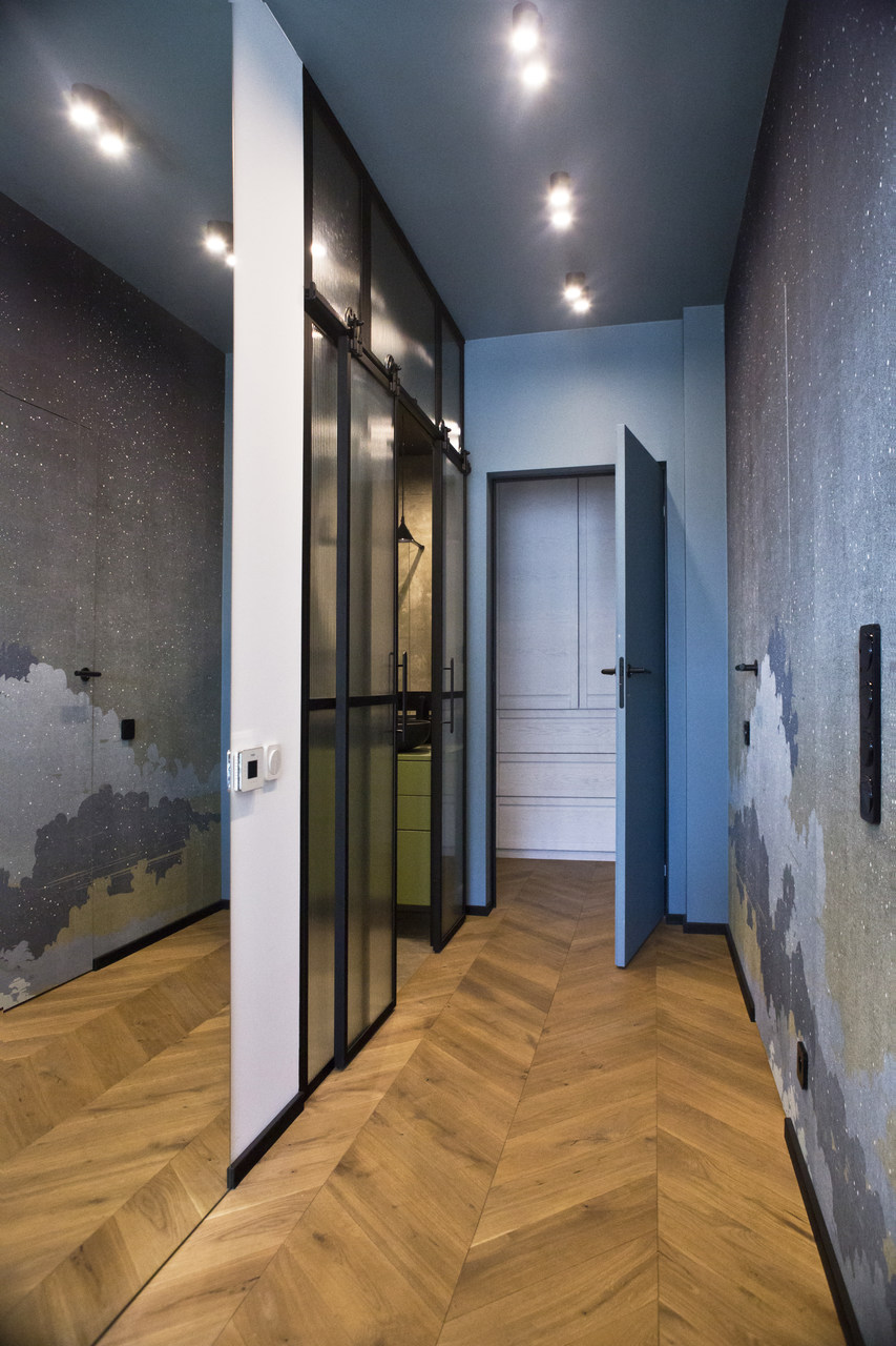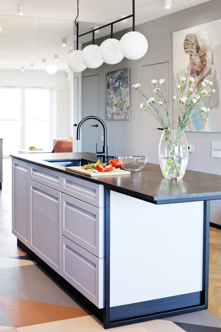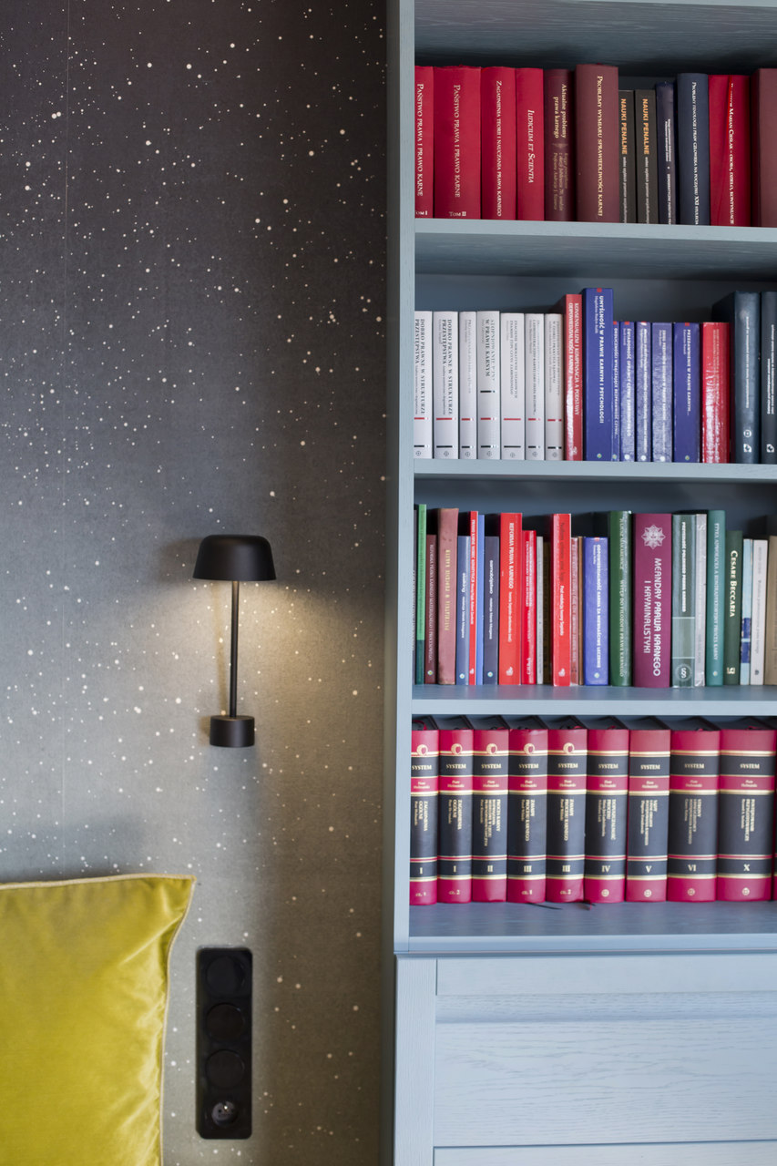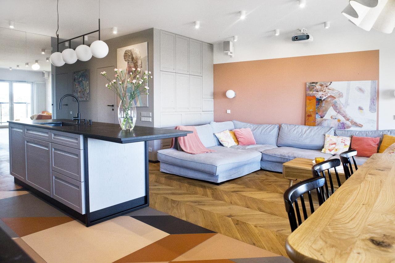 Projekt mieszkania na krakowskim Zabłociu. W aranżację tego apartamentu włożyłam całe serce. Mieszkanie zostało zaprojektowane z najwyższą starannością i dbałością o szczegóły. Salon połączony z kuchnią stanowi część centralną i serce apartamentu. Kolor Stormy Monday – odcień szarości – pokrywa większość ścian i mebli zrobionych na wymiar. Między szafkami oraz na wyspie znajdują się piękne ręcznie robione płytki, a blat to granit szczotkowany. Podłogę w kuchni zdobią płytki z kolekcji TIERRAS zaprojektowane przez Patricie Urquiole. Stół oświetla wykonana z filcu lampa Dancing zaprojektowana przez Iskosa Berlinga, wyglądem przypominająca spódnicę tańczącej baletnicy. W salonie znajduje się bardzo wygodny olbrzymi narożnik. Krzesła znajdujące się w mieszkaniu zostały zakupione na aukcjach staroci i odnowione. W jednej z łazienek można zrelaksować się w wolnostojącej wannie, natomiast w drugiej wziąć szybki prysznic. Łazienki zdobi czarna ceramika. Sypialnia w odcieniach błękitu, połączona z łazienką i garderobą stanowi idealne miejsce na odpoczynek. Łóżko w pięknym i oryginalnym kolorze skradło moje serce i musiało stać się głównym meblem w projektowanym pomieszczeniu. Mając do dyspozycji mebel w tak nietypowym odcieniu, nie było łatwo zaprojektować całą sypialnię tak, aby podkreślić jego walory i go nie przytłoczyć. Ściana za łóżkiem oraz prowadząca do łazienki i garderoby pokryta została piękną włoską tapetą. W mieszkaniu znajdują się jeszcze dwa pokoje dziecięce oraz pomieszczenie gospodarcze.