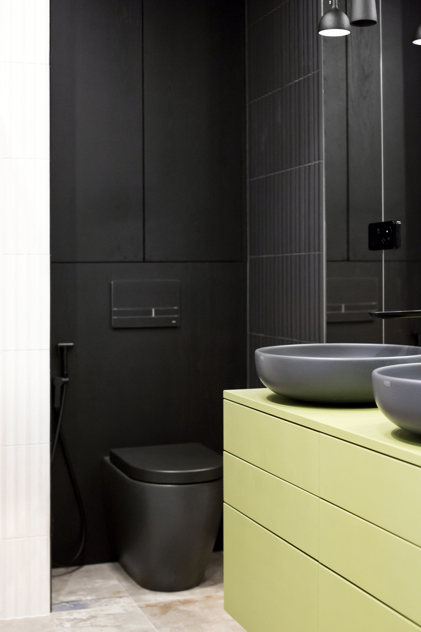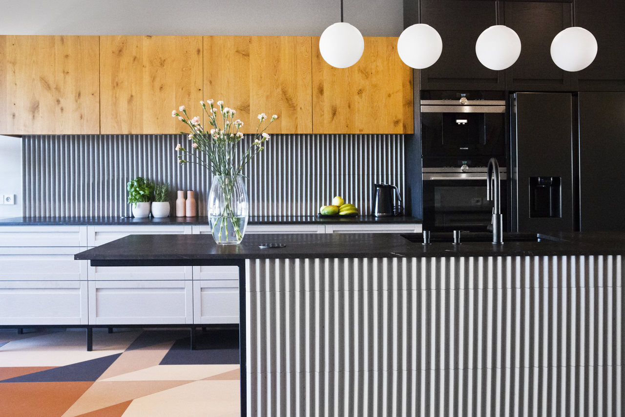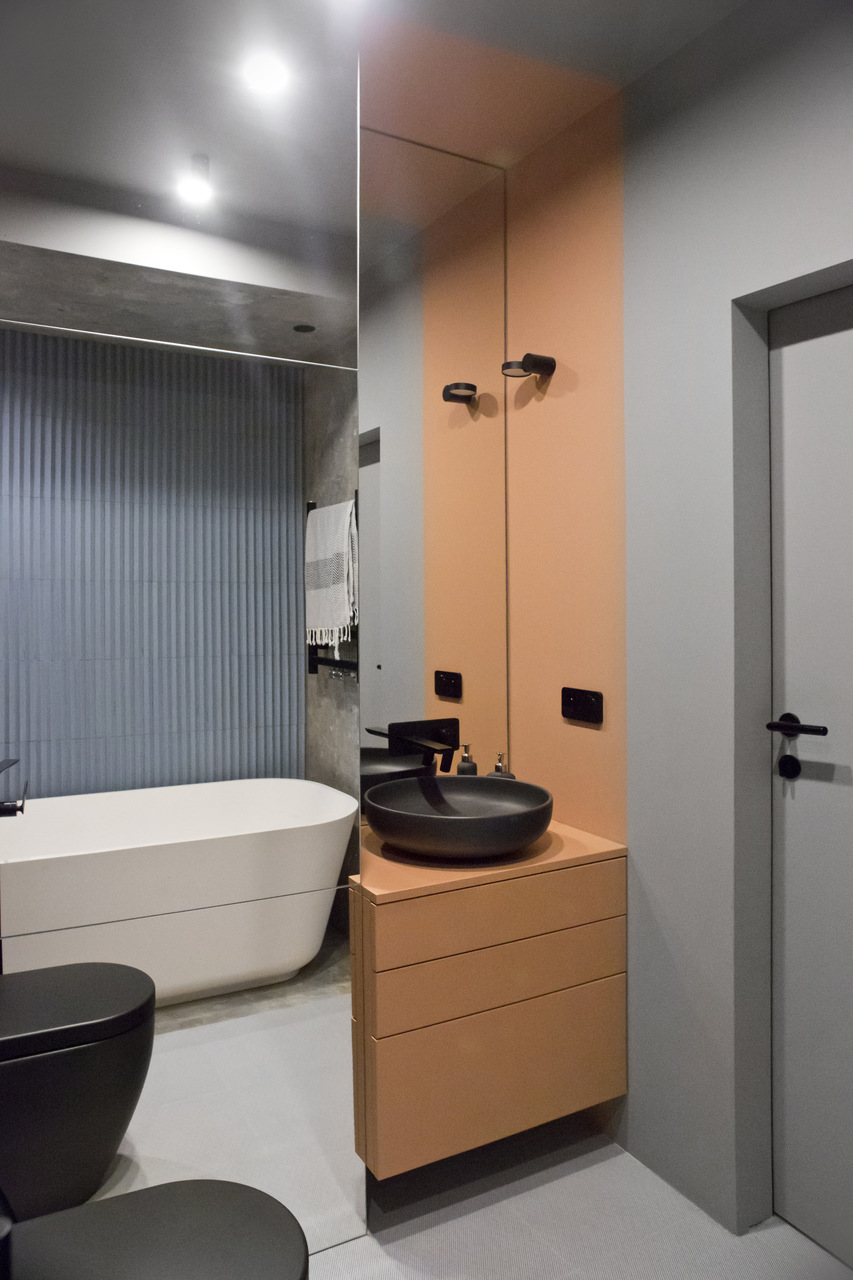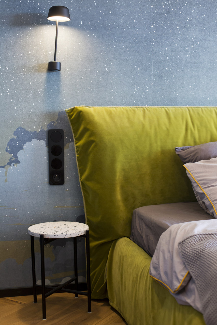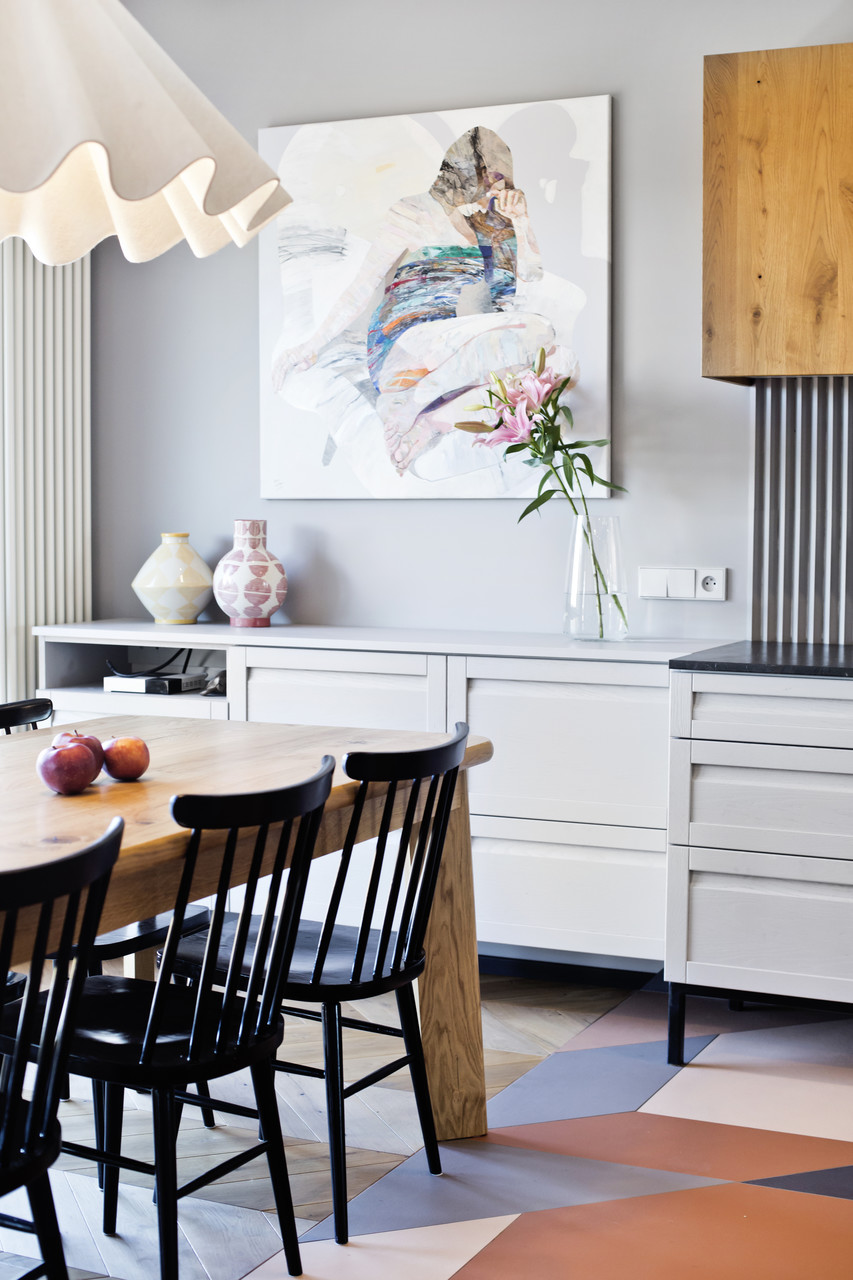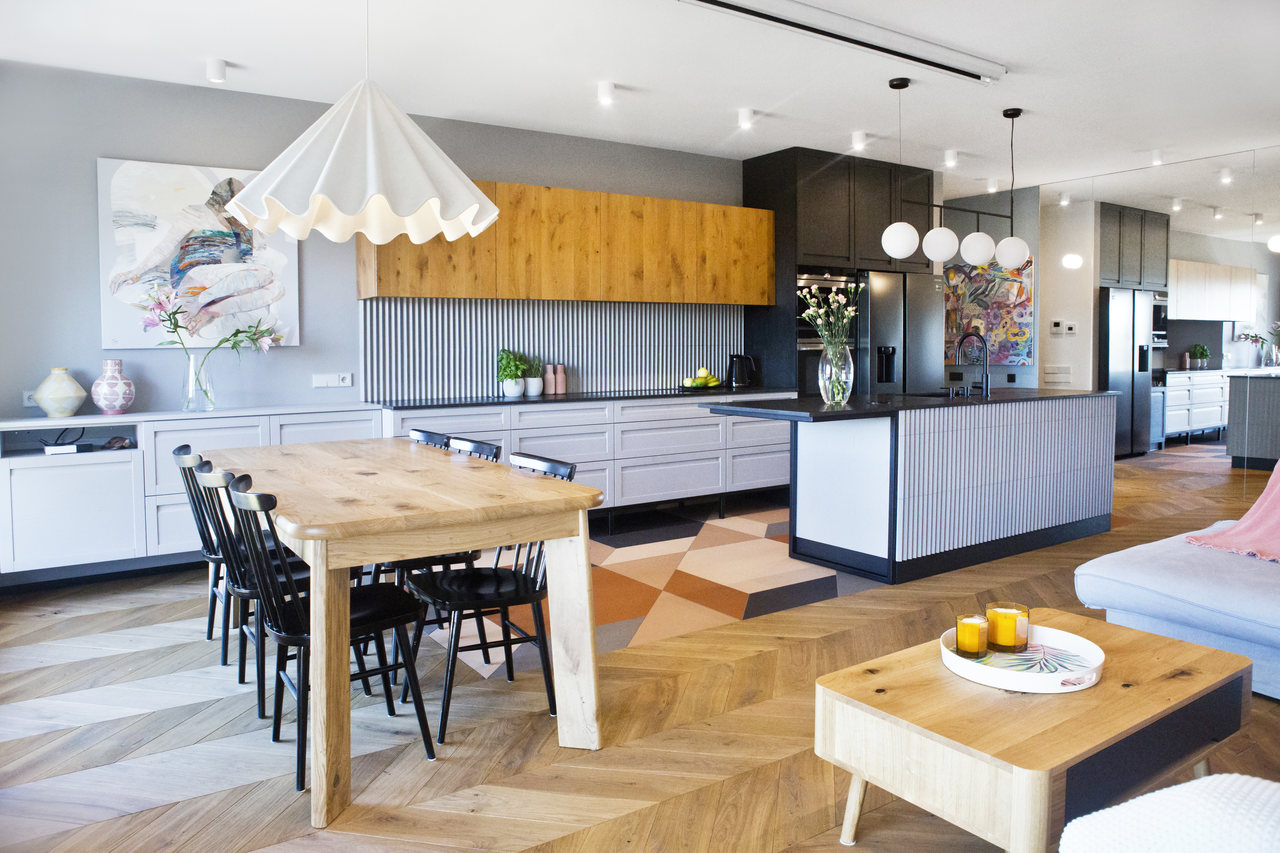 Projekt mieszkania na krakowskim Zabłociu. W aranżację tego apartamentu włożyłam całe serce. Mieszkanie zostało zaprojektowane z najwyższą starannością i dbałością o szczegóły. Salon połączony z kuchnią stanowi część centralną i serce apartamentu. Kolor Stormy Monday – odcień szarości – pokrywa większość ścian i mebli zrobionych na wymiar. Między szafkami oraz na wyspie znajdują się piękne ręcznie robione płytki, a blat to granit szczotkowany. Podłogę w kuchni zdobią płytki z kolekcji TIERRAS zaprojektowane przez Patricie Urquiole. Stół oświetla wykonana z filcu lampa Dancing zaprojektowana przez Iskosa Berlinga, wyglądem przypominająca spódnicę tańczącej baletnicy. W salonie znajduje się bardzo wygodny olbrzymi narożnik. Krzesła znajdujące się w mieszkaniu zostały zakupione na aukcjach staroci i odnowione. W jednej z łazienek można zrelaksować się w wolnostojącej wannie, natomiast w drugiej wziąć szybki prysznic. Łazienki zdobi czarna ceramika. Sypialnia w odcieniach błękitu, połączona z łazienką i garderobą stanowi idealne miejsce na odpoczynek. Łóżko w pięknym i oryginalnym kolorze skradło moje serce i musiało stać się głównym meblem w projektowanym pomieszczeniu. Mając do dyspozycji mebel w tak nietypowym odcieniu, nie było łatwo zaprojektować całą sypialnię tak, aby podkreślić jego walory i go nie przytłoczyć. Ściana za łóżkiem oraz prowadząca do łazienki i garderoby pokryta została piękną włoską tapetą. W mieszkaniu znajdują się jeszcze dwa pokoje dziecięce oraz pomieszczenie gospodarcze.